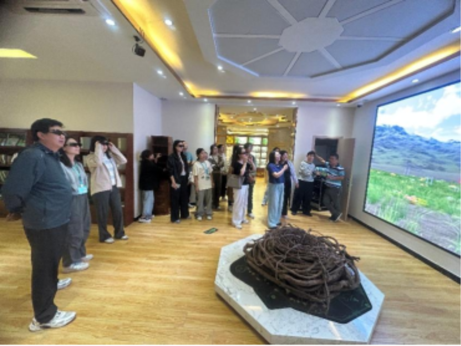 随后,在肖瑶老师带领下,大家集体在中药DIY实践中心开展了系统学习。该中心集教学、实践、体验于一体,陈列了包括浸制标本、水晶腊叶标本、珍贵系列药材、伪品标本等在内的1200余种药材标本。肖瑶老师为大家详细讲解了中心的建设理念与功能布局,党员同志们不仅通过VR、AR技术体验了“虚拟采药”的生动场景,还通过饮片体验区让大家直观感受到了中药的“五味”。特色展示区则通过房山地区中药材分布沙盘,向大家展示了本土药用资源的丰富性与多样性。